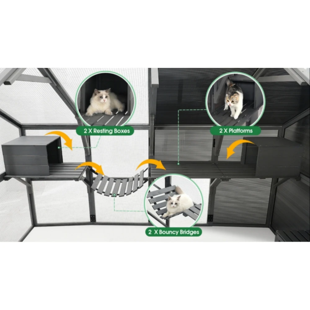 【Make Your Kitty Even Happier】Cat catio include 2 x Bridges, 2 x Resting Houses, 5 x Cat Walks Platforms, 2 x Seating Platforms, 1 Small Door, 1 Lager Door, and UV Proof Hollow Sheet. Resting rooms offer nap in the sun. Bridges satisfy your cat’s instinct to jump and climb. The walks can meet the needs of cats for walking and jumping. You can sitting on the Seat Platforms and watch them frolic in their new favourite spot. - 【Spacious Activity Area】56ft² outdoor cat enclosure offers a large space for your cats to enjoy running and playing freely. There's nothing better than having a cat on your lap, bonding time and a cat nap! Enjoy leisure time with your cats within the cat house can help strengthen your cat's bond with you.